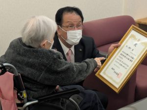 吉村 善美 富田林市長が100歳を迎えた入所者様のお祝いにお越しくださいました。